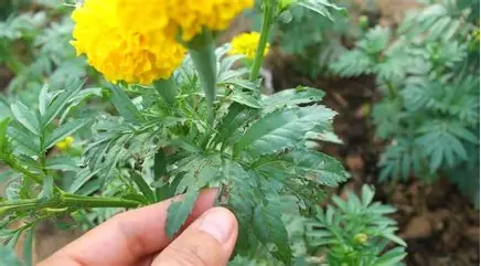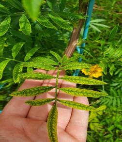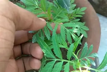 In marigolds, iron deficiency is quite common in alkaline soils of UP. The young leaves turn yellow between the veins, while the veins remain green, and in severe cases the leaves may even turn pale or whitish. This results in weak growth and poor flower quality.