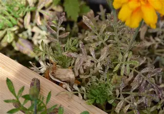 White, powdery fungal growth develops on the surface of leaves, stems, and flower buds. Affected leaves slowly turn yellow, curl, and dry out. Under severe infection, flower size is reduced, and flowering gets delayed.